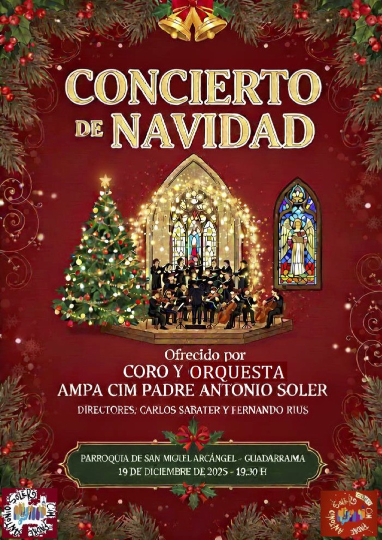 El próximo 19 de diciembre, el coro del AMPA CIM, dirigido por Carlos Sabater, y acompañado por la orquesta de alumnos, bajo la dirección de Fernando Rius, interpretarán el clásico Concierto de Navidad en la Parroquia de San Miguel Arcángel (Guadarrama) a las 19:30 h.